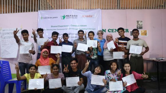 In partnership with the German NGO, Culture for Peace and Imedio PDI Kintha implements an innovative storytelling project in Sittway, Bu-May and Buthidaung townships: Young people from communities in conflict come together and tell each other Stories about their life and experiences in their communities. At the same time, in 6 modules, based on their own experiences, they learn about peace building, conflict analysis, change of perspective and the violence cycle and other topics. The project creates empathy and awareness by collecting, sharing and discussing biographical experience between communities in conflict.